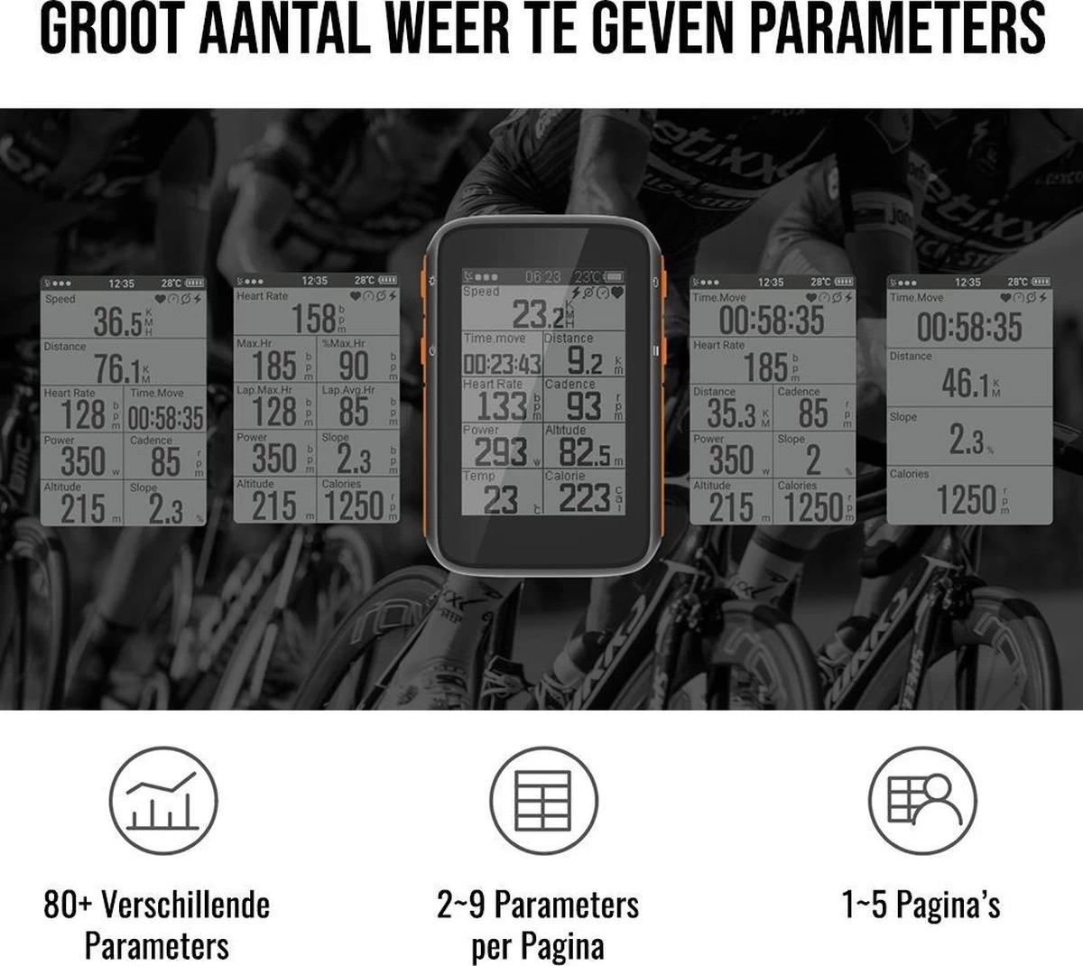 De GPS-fietscomputer heeft een 2,4-inch duidelijk af te lezen LCD-scherm met automatische achtergrondverlichting in donkere omstandigheden. Het apparaat heeft ook een antireflectiescherm dat het aflezen van gegevens gemakkelijk maakt in de felle zon. De fietscomputer biedt meer dan 80 verschillende soorten gegevens die zelf in te stellen zijn naar wens op 1 tot 5 pagina’s. Elke pagina kan 2 tot 9 gegevens weergeven, zoals snelheid, cadans, hartslag, vermogen, afstand, tijd, hoogte, helling, ronden, temperatuur, calorieën, etc. Deze gegevens zijn op te slaan voor 3 fietsen. Hiermee kun je eenvoudig de parameters instellen en opslaan, en makkelijk wisselen!