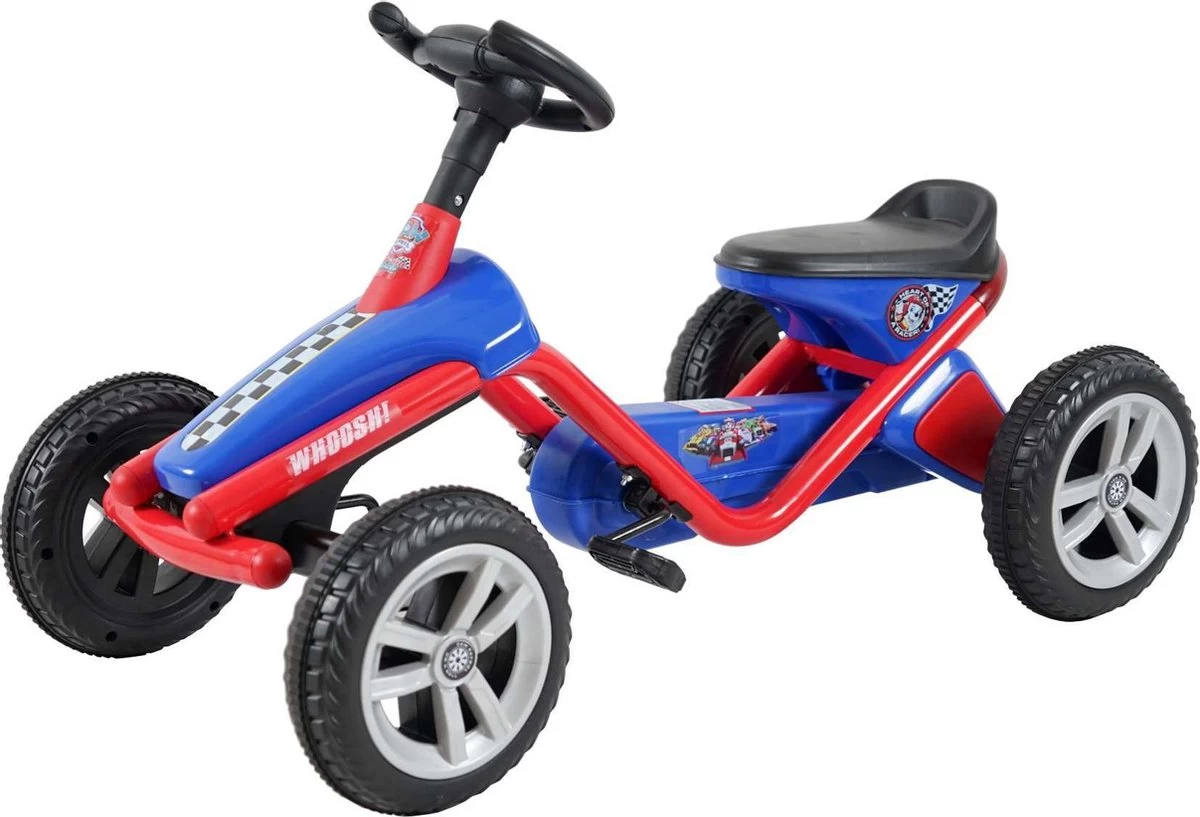 Paw Patrol Mini Go Kart rood blauw. Deze Go Kart is de vriend van iedere Paw Patrol fan. Hij is gedecoreerd met stoere Paw Patrol stickers en heeft vier stevige EVA-banden, waardoor hij geschikt is voor ieder avontuur. De kettingkast is gesloten. Het trapsysteem is vooruit en achteruit rijdend en heeft daardoor geen rem. De afmetingen van de Go Kart zijn 90*47*52 centimeter en hij kan maximaal belast worden met 25 kilogram. Deze Paw Patrol Mini Go Kart is geschikt voor kinderen van 3 tot 5 jaar oud. Whoosh, daar ga je!