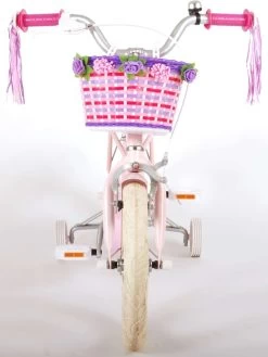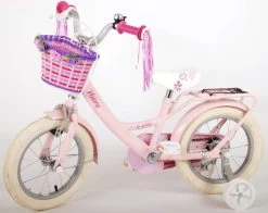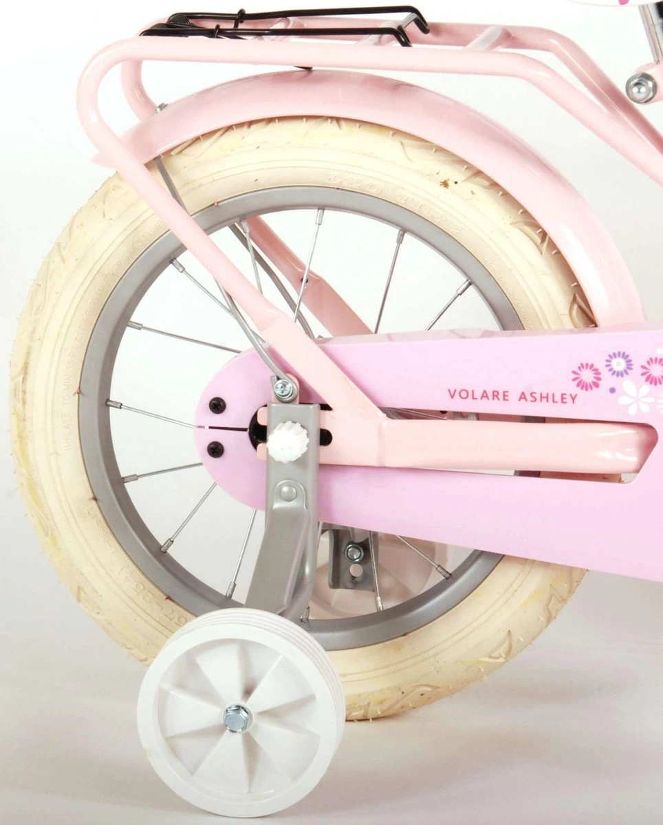 Volare Ashley 14 inch meisjesfiets. Deze beeldige Volare Ashley fiets is dé fiets die ieder meisje wil hebben. De achterdrager is geïntegreerd in het frame, waardoor de fiets een strak en modern uiterlijk heeft. Op deze achterdrager en in het fietsmandje kunnen alle belangrijke spulletjes mee worden genomen, waardoor uw kindje veilig de handjes aan het stuur kunnen houden. Met de handrem en terugtraprem kan de vaart worden verminderd. Het zachte zadel en de handvaten zorgen voor extra comfort en ter bescherming van de kleine vingertjes is de kettingkast gesloten. Met de fietsbel kun je iedereen laten weten dat je de hoek om komt. De afneembare zijwieltjes zorgen ervoor dat deze fiets een ideale fiets is om snel en goed te kunnen leren fietsen. De 14 inch luchtbanden van deze Volare Ashley fiets zorgen ervoor dat de fiets geschikt is voor meisjes tussen de 3.5 en 5 jaar oud met kledingmaat 98-110. Bovendien is de fiets voor 95% afgemonteerd, dus bijna fietsklaar. Wel zo gemakkelijk!